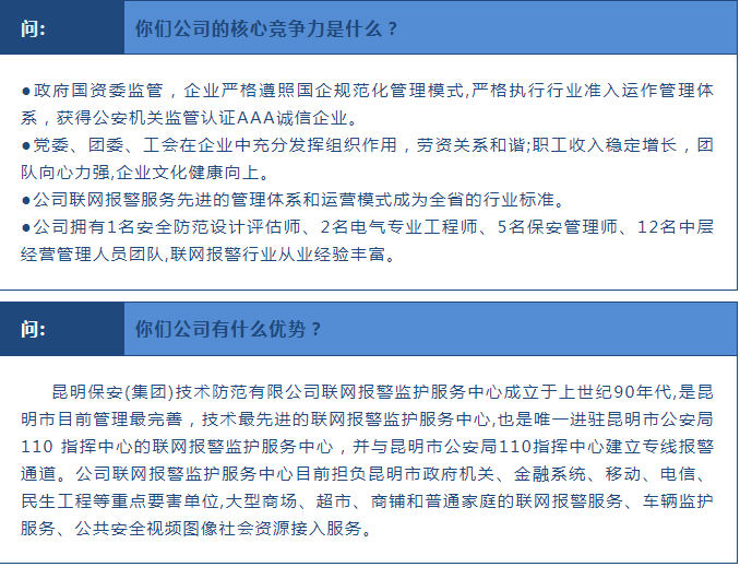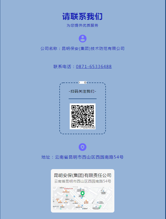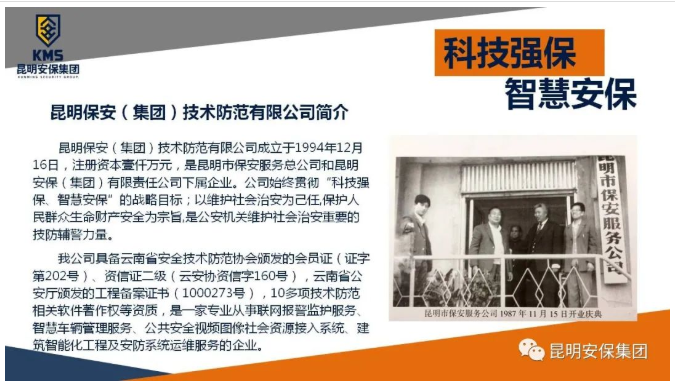 昆明保安(集團)技術防范有限公司成立于1994年12月16日,注冊資本壹仟萬元,是昆明市保安服務總公司和昆明安保(集團)有限責任公司下屬企業(yè)。公司始終貫徹“科技強保、智慧安保"的戰(zhàn)略目標;以維護社會治安為己任,保護人民群眾生命財產(chǎn)安全為宗旨,是公安機關維護社會治安重要的輔警力量。我公司具備云南省安全技術防范協(xié)會頒發(fā)的會員證(證字第202號)、資信證二級(云安協(xié)資信字160號) , 云南省公安廳頒發(fā)的工程備案證書( 1000273號) , 10多項安全技術防范相關軟件著作權等資質(zhì),是一家專業(yè)從事聯(lián)網(wǎng)報警監(jiān)護服務、智慧車輛管理服務、公共安全視頻圖像社會資源接入服務、建筑智能化工程及安防系統(tǒng)運維服務的企業(yè)。